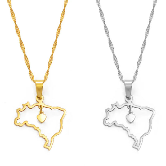 Brazil Heart Map Necklace • Dainty Silver Or Gold-Plated Stainless Steel Brasil-Shaped Pendant • Women Jewelry Gift For Brazilian Girlfriend