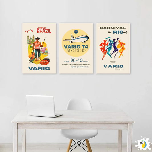 3-Set Varig Brazilian Airline Vintage Canvas Print • Restored 1960s Retro Aviation Ad Poster