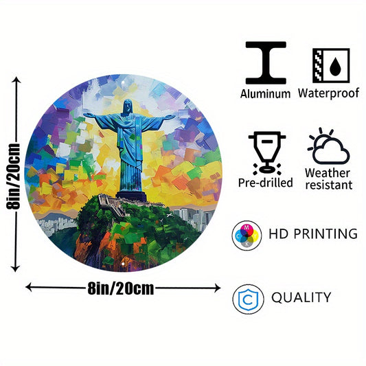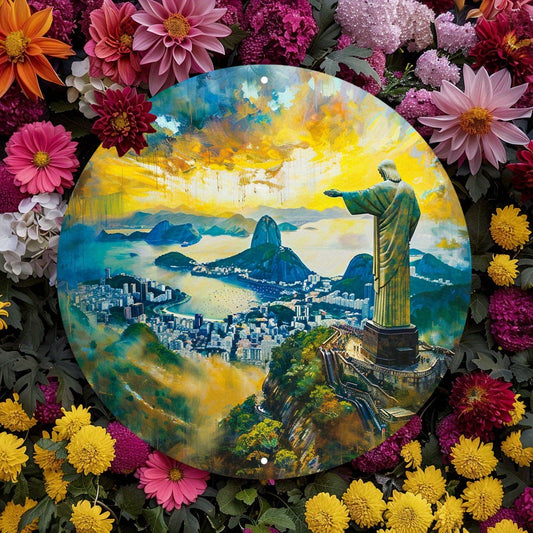 Christ The Redeemer Round Metal Print • Tropical Vibrance Rio De Janeiro Tin Sign • Brazil Wall Art Decor Gift For Brazilian