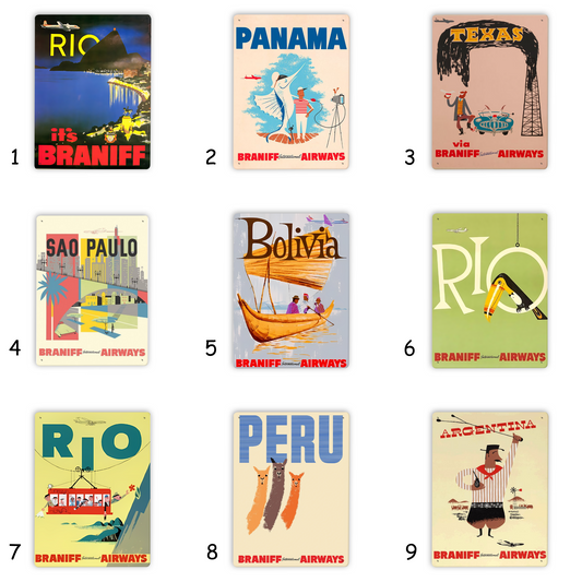 Vintage Flight Destination Poster Tin Sign Collection • Retro Airline Travel Ad Metal Prints